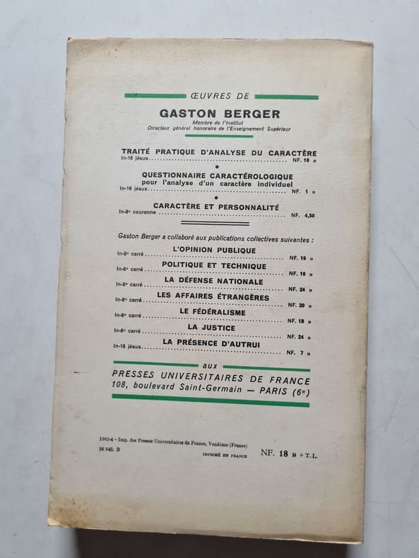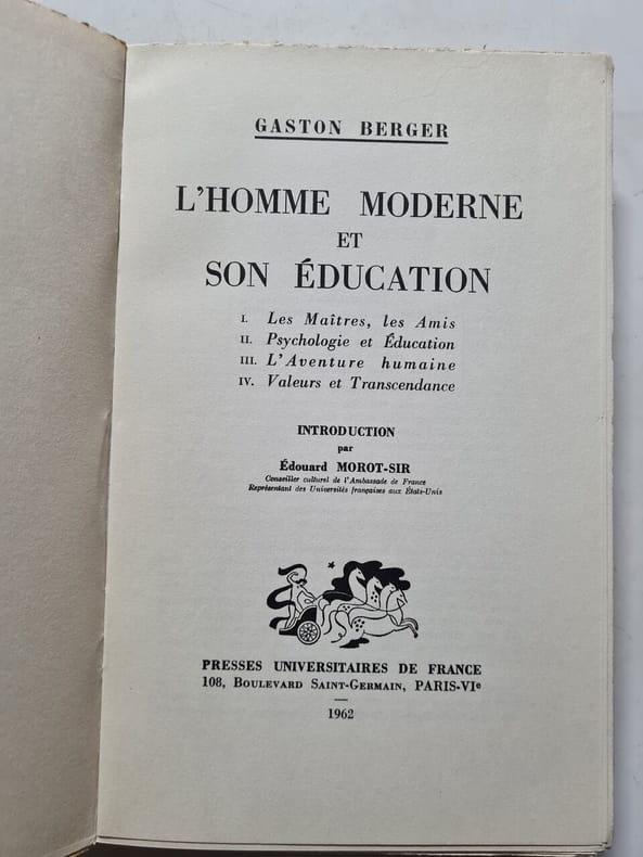 Paris Presses Universitaires de France P.U.F 1962 in 8 (22,5x14) 1 volume broché, VII et 368 pages, quelques rousseurs éparses sur la couverture. Introduction par Edouard Morot-Sir. I: Les Maîtres, Les Aamis; II: Psychologie et Education; III: L'Aventure humaine; IV: Valeurs et Transcendance. Première édition. Bon exemplaire