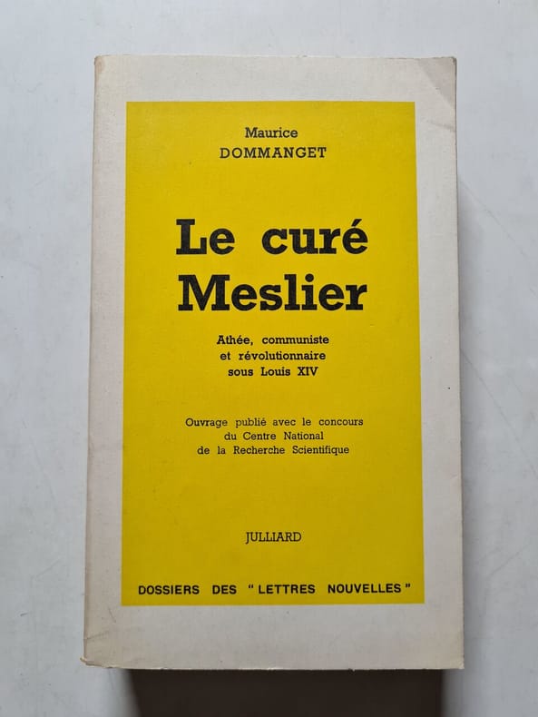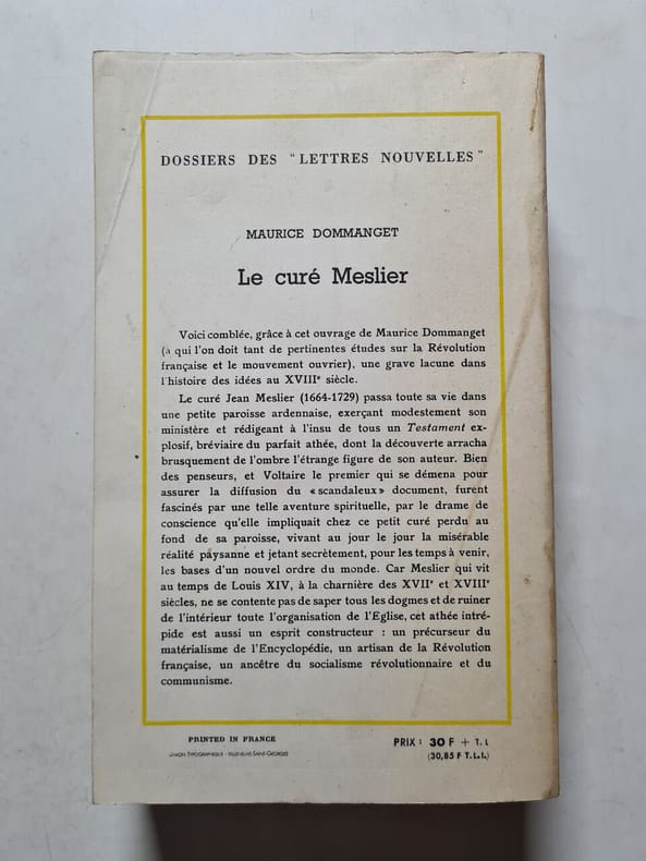 L'abbé Meslier, n'avait pas la foi, mais avait des convictions.Toute sa vie il les coucha par écrit, en secret, dans deux gros manuscrit, afin de démontrer le bien fondé de son athéisme . Durant de nombreuses années , il continua ainsi d'officier le jour et d'écrire la nuit .Meslier garda toute sa vie cette bibliothèque à l'arrière du presbytère, ses écrits ne furent découvert qu'à sa mort en 1729 . Voltaire le premier en fit connaitre l'existence, de façon clandestine mais ce n'est qu'en 1790 que Sylvain Maréchal publia le catéchisme du Curé Meslier que voici.*Histoire naturelle des moines, écrite d’après la méthode de M. de Buffon, A Paris, quai des Augustins, 1790. Frontispice, XVI, 34 p. *Suivi de : De la conduite des curés dans les circonstances présentes, ou bien lettres d’un curé de campagne à son confrère, député à l’Assemblée Nationale, sur la conduite à tenir par les pasteurs des âmes, dans les affaires du jour, A Paris, de l’imprimerie Crapart, 1790. 16 p. *Suivi de : Développement du serment exigé des prêtres en fonction par l’Assemblée Nationale, extrait du journal ecclésiastique, numéro de décembre, Sl, sd. 15 p. *Suivi de : Lettre de M. de la Marche, ancien évêque de Léon à M. Laligne, vicaire de Saint Louis de Brest (…), A Brest, Malassis, 1791, 16 p. *Suivi de : Réponse de M. Doucet, curé de S. Pierre les Olivettes en Languedoc à M. l’évêque de Béziers (…), Sl, sd.19 p. *Suivi de : Le mariage des prêtres, ou le célibat détruit par un citoyen de B., Sl, 1790. 19 p. *Suivi de : Le mariage des prêtres réfutés ou le célibat vengé par M. Lesueur et P. Deburres, A Dieppe, Dubuc, 1790. 16 p. *Suivi de : Manifeste et protestation de cinquante mille français fidèles, armés dans le Vivarais pour la cause de la religion et de la monarchie, contre les usurpations de l’Assemblée soit disant Nationale, Au camp de Jales, octobre 1790. 30 p. *Suivi de : Catéchisme du curé Meslier, mis au jour par l’almanach des honnêtes gens (Sylvain Maréchal). L’An Premier du Règne de la Raison et de la Liberté ; de l’Ere vulgaire, Sl, 1790. Frontispice gravé, 55 p. *Suivi de : Réflexions d’un ami de la liberté ou principes de M. l’abbé de Mably, Sl, juin 1790. 8 p. *Suivi de : Réflexions très impartiales d’un citoyen sur la diminution des paroisses de Rouen et autres villes et campagnes du royaume, Sl, sd. 8 p. *Suivi de : Prône d’un bon curé sur le serment civique exigé des évêques et des curés, des prêtres en fonctions, A Paris chez Crapart, sd. 15 p. *Suivi de : Serment prononcé par M. l’abbé Mauger, curé maire d’Isneauville près Rouen, le dimanche 23 janvier 1791, Rouen, sd. 8 p. *Suivi de : Adresse à tous les citoyens du département de la Seine Inférieure sur le serment que doivent prêter les ecclésiastiques fonctionnaires publiques, Sl, sd. 23 p. *Suivi de : De par la mère Duchesne, anathèmes très énergiques contre les jureurs (…), Sl, sd. 23 p. *Suivi de : Discours d’un ecclésiastique fonctionnaire publique du district de Reims, Rouen, 1791. 8 p. *Suivi de : Lettres curieuses et patriotiques, Sl, sd. 8 p. *Suivi de : Discours prononcé par M. Noyon (…) lors de la prestation de son serment civique. Le 23 janvier 1791, Sl, sd. 6 p. *Suivi de : Exhortation des ecclésiastiques sur les circonstances actuelles, Paris, Granger, 1791. 16 p. *Suivi de : Ordonnance de M. l’évêque de Soissons, Crapart, 1791. 16 p. *Suivi de : Instruction pastorale de M. le ci-devant archevêque de Rouen, mis en pot pourri, pour en faciliter l’intelligence, Sl, sd. 7 p. *Suivi de : Instruction pastorale de M. le cardinal de la Rochefoucauld, archevêque de Rouen, au clergé séculier et régulier et aux fidèles de son diocèse, Paris, Crapart, 1791. 24 p. *Suivi de : Ordonnance de M. le cardinal de la Rochefoucauld, archevêque de Rouen (…), Paris, Crapart, 1791. 11 p. *Suivi de : Le livre de sang, ou calcul abrégé des assassinats commis ou occasionnés par les prêtres avec d’horribles massacres d’un grand nombre de Patriotes du Comtat par l’évêque de Vaison, Paris, sd. 8 p. *Suivi de : Le clergé chassé du collège, ou l’éducation confiée aux magistrats, Sl, sd. 8 p. *Suivi de : Consultation pour les religieuses, Paris, Guerbart, 1791. 8 p. *Suivi de : Le retour de l’abbé Maury aux enfers, ou le massacre de Carpentras en Avignon, Sl, sd. 8 p.