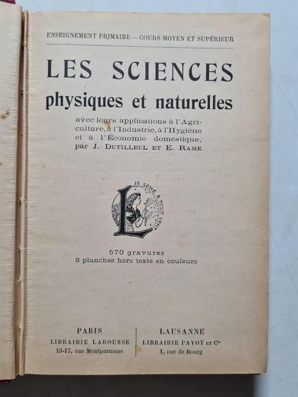 Montluçon, A. Thorinaud,[imprimerie de la "Librairie des écoles"], s.d. [circa 1912] ; petit in-8. 310pp.-3ff. 477 figures in-texte. Cartonnage illustré de l'éditeur, dos de toile verte, étiquette de titre en papier (frottée). Quelques feuillets déboités, manque angulaire de papier à la page de faux-titre.