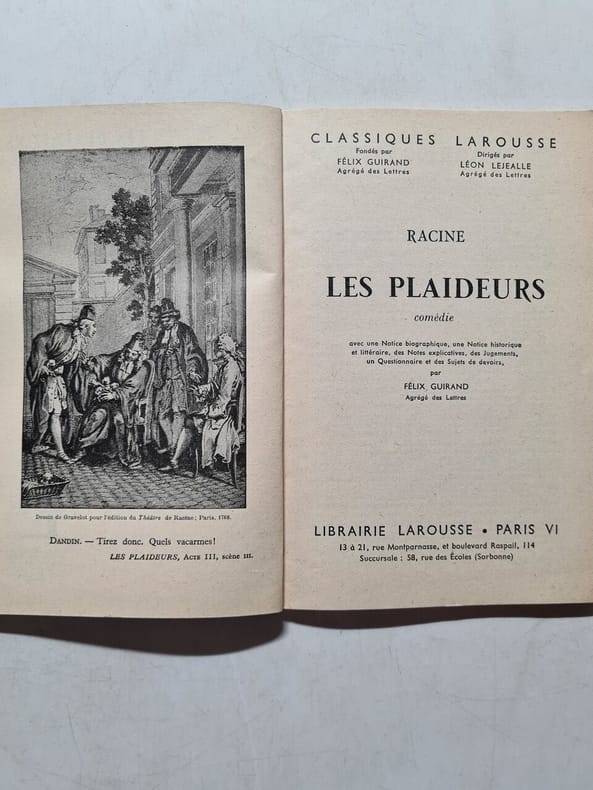 Les Plaideurs, pièce créée en 1668, contient quelques fameux vers de Racine. Citons bien sûr « Qui veut voyager loin ménage sa monture », mais aussi « Si vous parlez toujours, il faut que je me taise » ; ou encore « on ne court pas deux lièvres à la fois », « on apprend à hurler avec les loups », « je dois parler, je parle, j'ai parlé », « l'un veut plaider toujours, l'autre toujours juger ». Sans oublier le fameux « Point d'argent, point de Suisse » ! Farce inattendue dans l'oeuvre de Racine créée entre Andromaque et Britannicus, Les Plaideurs est l'un de ses plus grands succès. Une gageure, pour une pièce en alexandrins où le vocabulaire juridique est omniprésent. Cette première édition illustrée par Dubout est l'une de ses meilleures réalisations. Exemplaire en parfait état, tel que paru, sous son étui-chemise éditeur.