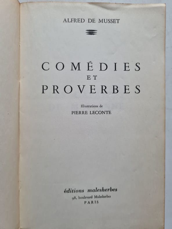 Paris L'Edition d'Art H. Piazza 1932 in 8 (19x13,5) 12 volumes reliures demi maroquin rouge à longs grains, et petits coins, dos à nerfs soulignés de filets dorés et ornés de très fins fleurons dorés, têtes dorées, couvertures illustrées en couleurs conservées. Avec de nombreux ornements décoratifs et 309 illustrations en couleurs dont 12 frontispices pleine page de André-E. Marty, gravés sur bois par E. Gasparini. Tome I: Poésies I - Contes d'Espagne et d'Italie; Poésies diverses. Tome II: Poésies II - Un spectacle dans un fauteuil; Poésies nouvelles. Tome III: Poésies III - Poésies nouvelles (suite et fin). Tome IV: Comédies et Proverbes I - André del Sarto; Lorenzaccio. Tome V: Comédies et Proverbes II - Les caprices de Marianne; Fantasio; On ne badine pas avec l'amour. Tome VI: Comédies et Proverbes III - La nuit vénitienne; Barberine; Le chandelier. Tome VII: Comédies et Proverbes IV - Il ne faut jurer de rien; Un caprice; Il faut qu'une porte soit ouverte ou fermée; Louison. Tome VIII: Comédies et Proverbes V - On ne saurait penser à tout; Carmosine; Bettine. Tome IX: Nouvelles et Contes I - Emmeline; Les deux maitresses; Frédéric et Bernerette. Tome X: Nouvelles et Contes II - Le fils du Titien; Margot; Croisilles; Pierre et Camille. Tome XI: Nouvelles et Contes III - Le secret de Javotte; Histoire d'un merle blanc; Mimi Pinson; La mouche. Tome XII: La confession d'un enfant du siècle. Tirage limité à 2250 exemplaires, celui-ci un des 200 exemplaires numérotés sur pur fil de Rives contenant une suite en noir des illustrations. Reliures non signées, mais attribuables à A. Valat (relieur à Montpellier). Superbe ensemble, très finement relié, ors rutilants ( Photographies sur demande / We can send pictures of this book on simple request )