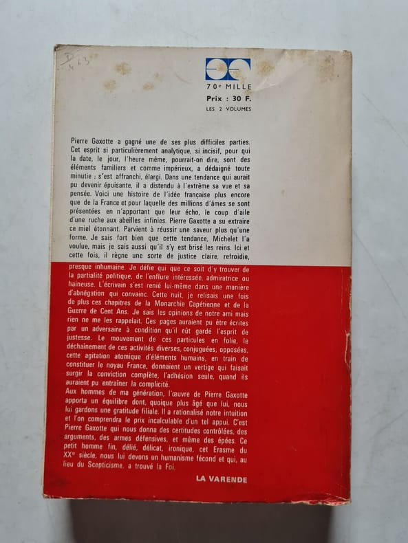 État : Bon état - Année : 1951 - Format : in 8° - Tome(s) : 2 volumes - Pages : 577 et 575pp - Editeur : Flammarion - Lieu d'édition : Paris - Type : Cartonnage éditeur illustré - Divers : Cartonnages un peu jaunis, tâchés et frottés aux franges. Ouvrages solides et propres. - Collection : L'Histoire - Commander rapidement : https://www.bons-livres.fr/livre/pierre-gaxotte/8843-histoire-des-francais?lrb
