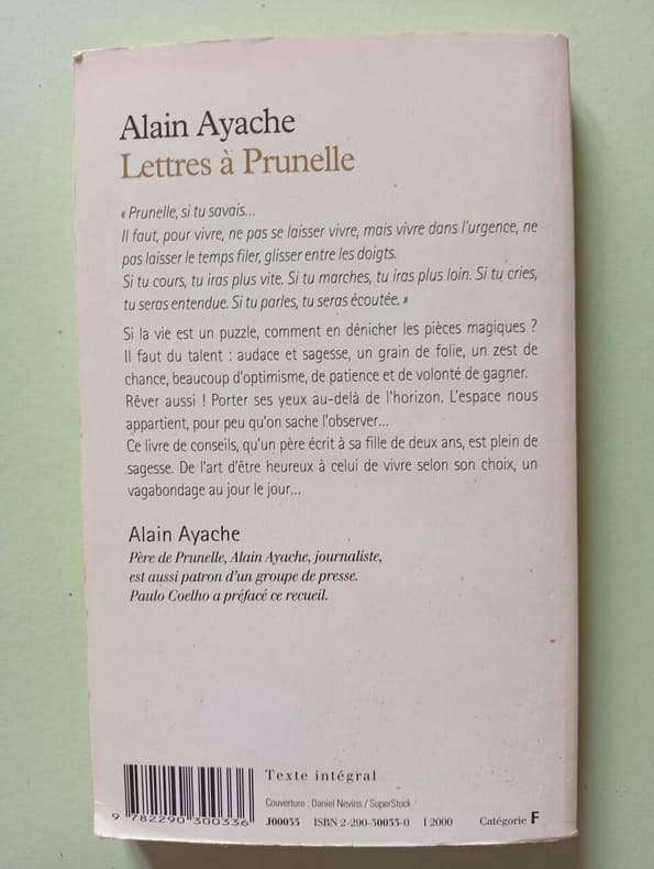 "Les Lettres à Prunelle constituent un guide de sagesse universelle, un véritable manuel philosophique. Chacun peut y trouver matière à réflexion, à méditation, à enseignement. Ces " lettres " ont été écrites par Alain Ayache, et sont autant de maximes, de pensées, qu'il destine à sa fille. Comme tout parent, il s'est interrogé sur l'avenir de son enfant, lui transmettant conseils et remarques afin de la guider, de la soutenir tout au long de sa vie. Qualités, défauts, vertus, tout est passé au crible par ce père attentionné qui délivre ainsi une sorte de mode de conduite à l'usage de sa propre chair. En petits textes courts, fables, réflexions saisies sur le vif, observations, fruits de ses expériences, il s'adresse à la future femme qui sommeille en Prunelle et qui, un jour, lira ces lignes. Ces textes nous renvoient à nos propres histoires d'enfance. " De même que nous avons entendu les histoires de nos parents, nous racontons ce que nous avons vu à nos enfants, qui raconteront à leurs enfants, et ainsi de suite. Nos histoires sont notre héritage ", tel que l'écrit dans sa préface Paulo Coelho."