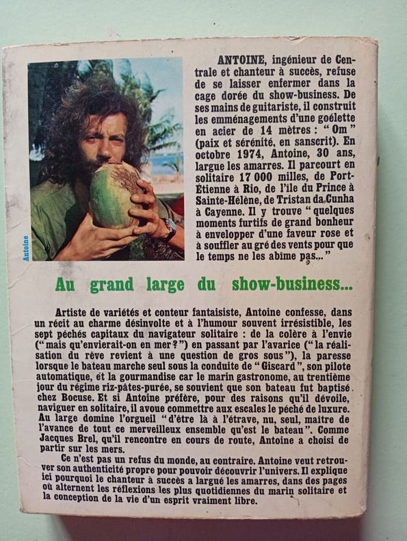 Edition originale pour laquelle il n'a pas été tiré de grands papiers. Agréable exemplaire, iconographie. Amusant envoi autographe signé d'Antoine, le célèbre chanteur-navigateur, à un proche ami : " Salut vieux camarade 250 pages pour te faire baver d'envie ! Antoine". - Photographies et détails sur www.Edition-Originale.com -
