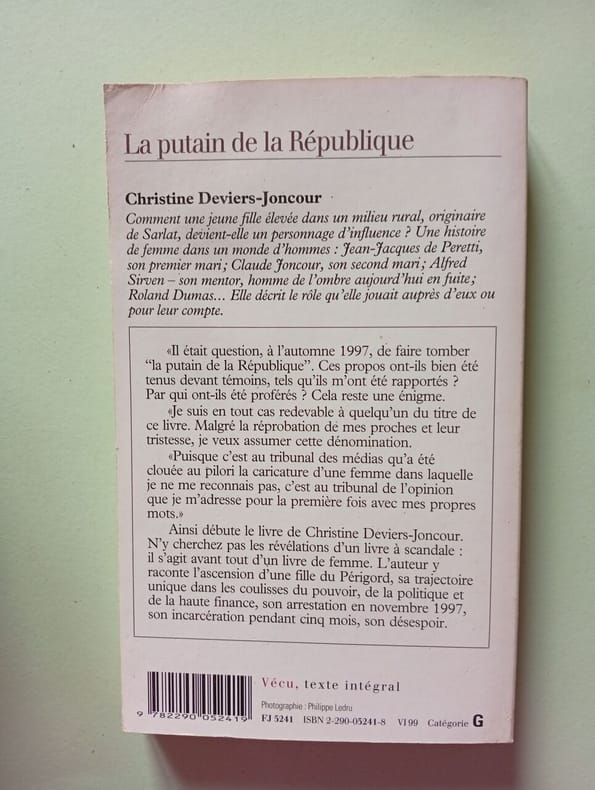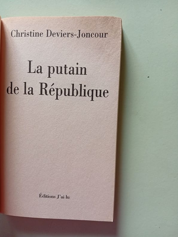Christine Deviers-Joncour. Comment une jeune fille élevée dans un milieu rural, originaire de Sarlat, devient-elle un personnage d'influence ? Une histoire de femme dans un monde d'hommes : Jean-Jacques de Peretti, son premier mari ; Claude Joncour, son second mari ; Alfred Sirven – son mentor, homme de l'ombre aujourd'hui en fuite ; Roland Dumas... Elle décrit le rôle qu'elle jouait auprès d'eux ou pour leur compte. "Il était question, à l'automne 1997, de faire tomber "la putain de la République". Ces propos ont-ils bien été tenus devant témoins, tels qu'ils m'ont été rapportés ? Par qui ont-ils été proférés ? Cela reste une énigme. Je suis en tout cas redevable à quelqu'un du titre de ce livre. Malgré la réprobation de mes proches et leur tristesse, je veux assumer cette dénomination. Puisque c'est au tribunal des médias qu'a été clouée au pilori la caricature d'une femme dans laquelle je ne me reconnais pas, c'est au tribunal de l'opinion que je m'adresse pour la première fois avec mes propres mots." Ainsi débute le livre de Christine Deviers-Joncour. N'y cherchez pas les révélations d'un livre à scandale il s'agit avant tout d'un livre de femme. L'auteur y raconte l'ascension d'une fille du Périgord, sa trajectoire unique dans les coulisses du pouvoir, de la politique et de la haute finance, son arrestation en novembre 1997, son incarcération pendant cinq mois, son désespoir.