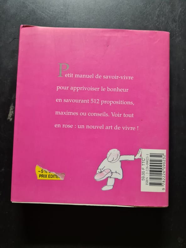 Albin michel 1999 247 pages 13cmx15cmx2 1cm. 1999. Broché. 247 pages. Petit manuel de savoir-vivre pour apprivoiser le bonheur en savourant 512 propositions maximes ou conseils. Voir tout en rose : un nouvel art de vivre