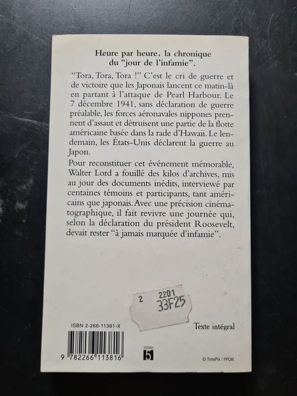 Heure par heure, la chronique, minute après minute, du "jour de l'infamie". "Tora, Tora, Tora !" C'est le cri de guerre et de victoire que les Japonais lancent ce matin-là en partant à l'attaque de Pearl Harbour. Le 7 décembre 1941, sans déclaration de guerre préalable, les forces aéronavales nippones prennent d'assaut et détruisent la base américaine de la rade d'Hawaii. Le lendemain, les Etats-Unis déclarent la guerre au Japon. Pour reconstituer cet événement mémorable, Walter Lord a fouillé des kilos d'archives, mis au jour des documents inédits, interviewé par centaines témoins et participants, tant américains que japonais. Avec une précision cinématographique, il fait revivre une journée qui, selon la déclaration du président Roosevelt, devait rester "à jamais marquée d'infamie".