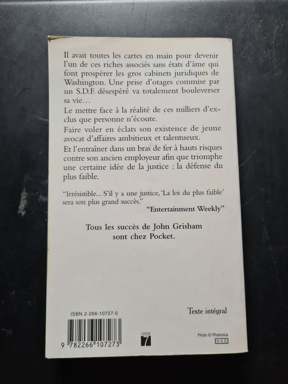 Pocket / Best 2001 382 pages poche. 2001. broché. 382 pages. Il avait toutes les cartes en main pour devenir l'un de ces riches associés sans états d'âme qui font prospérer les gros cabinets juridiques de Washington. Une prise d'otages commise par un S.D.F. désespéré va totalement bouleverser sa vie... Le mettre face à la réalité de ces milliers d'exclus que personne n'écoute. Faire voler en éclats son existence de jeune avocat d'affaires ambitieux et talentueux. Et l'entraîner dans un bras de fer à hauts risques contre son ancien employeur afin que triomphe une certaine idée de la justice : la défense du plus faible. Irrésistible... S'il y a une justice. La loi du plus faible sera son plus grands succès