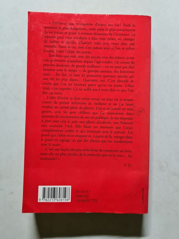 Fayard 2000 268 pages in8. 2000. broché. 268 pages. Qu'est-ce qui m'empêche d'aimer ma vie ? Voilà la question la plus dangereuse mais aussi la plus constructive qu'on puisse se poser à certains moments de l'existence. La réponse peut vous conduire à faire tout valser ou changer de métier et décider d'habiter seule avec votre chat par exemple. Dans la vie rien n'est jamais joué si l'on se refuse à subir à être l'objet des autres. Tant bien que mal avec des succès avec des échecs je me suis gouvernée quasiment depuis l'âge tendre ; j'ai connu de grandes douleurs de grands malheurs - on ne peut pas être heureux tout le temps - de grandes amours des honneurs aussi... En fait ce sont les premières quarante années qui ont été les plus dures... Quarante oui. C'est absurde de croire que l'on est heureux parce qu'on est jeune. L'élan vital c'est superbe. Ca ne suffit pas à vous dire ce que l'on fait sur terre. L'idée d'écrire ce livre m'est venue un jour où je pestais contre de petites infirmités de vieillesse et où j'ai laissé tomber un carton plein de photos. J'en ai accumulé en tous genres avec les gens célèbres que j'ai interviewés dans quantité de circonstances de ma vie publique. Je me disposais à jeter tout cela et puis une photo décolorée une Polaroïd m'a accroché l'oeil. Elle fixait un moment que j'avais complètement oublié et qui résonnait avec le présent. J'ai pensé que j'allais m'en emparer et à partir de là voyager dans le passé en zigzags au gré des photos qui me tomberaient sous la main. C'est une façon très peu orthodoxe de construire un livre mais elle est plus proche de la mémoire que ne le sont... les mémoires