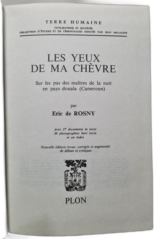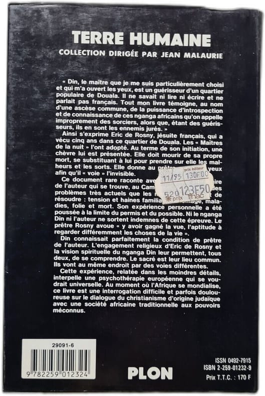 Sans date. Le livre est le récit autobiographique d'Éric de Rosny prêtre jésuite français qui relate son initiation au ndimsi un art de vision surnaturelle pratiqué par les guérisseurs traditionnels (ngangas) au Cameroun. Au terme de cette initiation un rituel impliquant une chèvre sacrificielle lui confère la capacité de "voir l'invisible". L'ouvrage explore la complexité de la sorcellerie et des pratiques de guérison en les présentant comme un système de pensée et un mécanisme social loin des clichés occidentaux