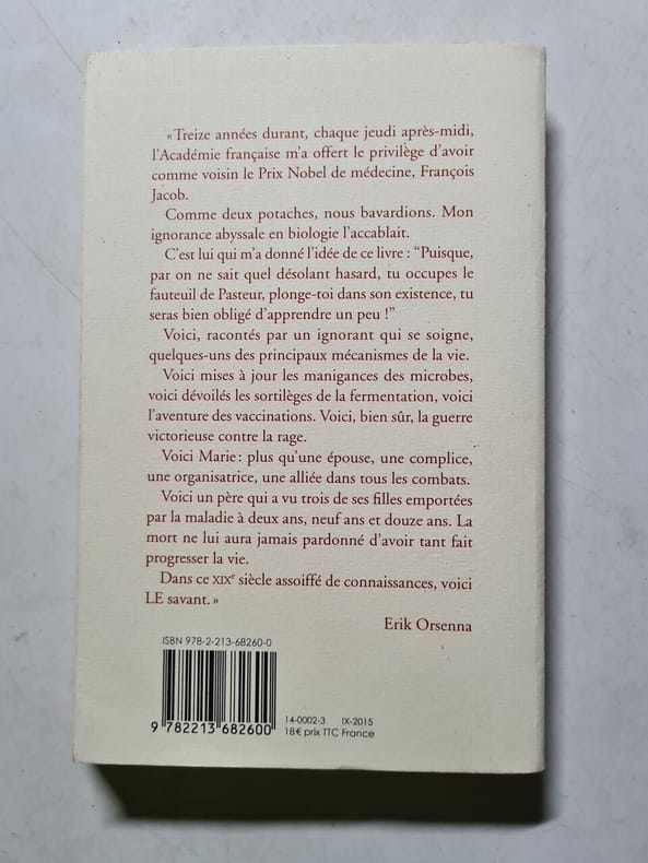 Fayard 2015 198 pages 13x20x2cm. 2015. Broché. 198 pages. Dans "La Vie la Mort la Vie" Erik Orsenna explore la vie et les travaux du célèbre scientifique Louis Pasteur (1822-1895). Le livre mêle le récit personnel de l'auteur inspiré par ses conversations avec le Prix Nobel François Jacob à une plongée dans les découvertes de Pasteur de ses recherches sur le vin et le ver à soie à sa victoire contre la rage. Il s'agit d'un portrait à la fois intime et érudit d'un homme complexe présenté à travers une narration originale qui intègre lettres discours et documents d'époque