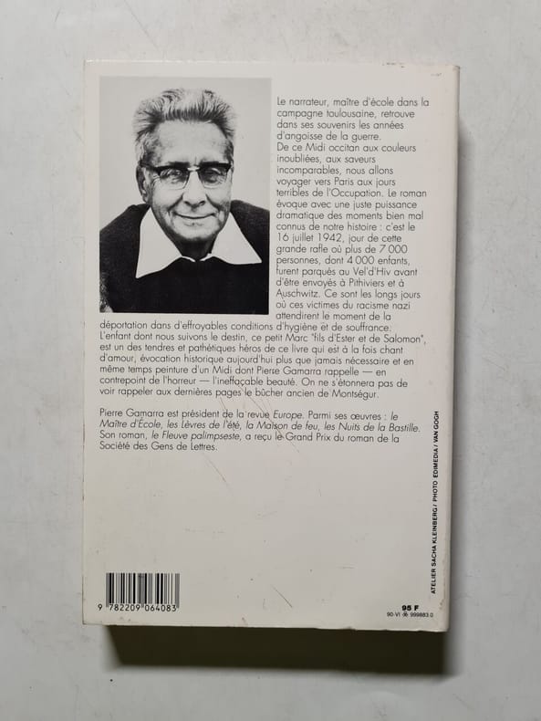 editions messidor 1942 1942. ouvrage broché 240 pages en TRES BON ETAT; complet et solide sans déchirures ni annotations intérieur propre; quasiment pas de pliures sur la couverture Le. narrateur maitre d'ecole dans la campagne toulousaine evoque d'abord. la periode de la drole de guerre. Parmi les. ecoliers qui l'entourent un jeune Espagnol refugie une fillette aux. reves baroques et surtout ce petit Marc fils. d'Esther et de Salomon dont le destin va former une des trames du. roman. Le recit se deroule depuis l'Espagne jusqu'aux pays occitans . depuis des temps anciens jusqu'aux annees de la guerre jusqu'au Jeudi Noir du 16 juillet 1942 ou 7 000 personnes . dont 4 000 enfants raflees dans Paris furent parquees au Vel'd'Hiv. avant d'etre deportees a Auschwitz. Entre-temps dans ce Midi aux. couleurs inoubliees un autre amour est evoque une femme disparait dans. la tourmente de la guerre par un soir de ces automnes toulousains dont. Pierre Gamarra rappelle l'ineffacable beaute. Un contrepoint d'amour. et de mort se poursuit dans ce livre ou l'on ne s'etonnera pas de voir. rappele le dernier jour de Montsegur