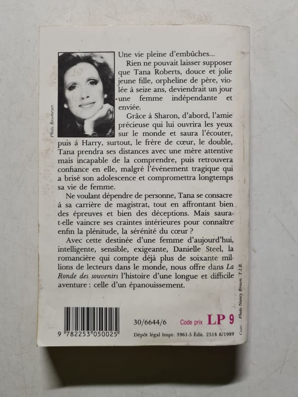 Le livre de poche 1989 346 pages in12. 1989. Broché. 346 pages. Une vie pleine d'embûches... Rien ne pouvait laisser supposer que Tana Roberts douce et jolie fille orpheline de père violée à seize ans deviendrait un jour une femme indépendante et enviée. Grâce à Sharon d'abord l'amie précieuse qui lui ouvrira les yeux sur le monde et saura l'écouter puis à Harry surtout le frère de coeur le double Tana prendra ses distances avec une mère attentive mais incapable de la comprendre puis retrouvera confiance en elle malgré l'événement tragique qui a brisé son adolescence et compromettra longtemps sa vie de femme. Ne voulant dépendre de personne Tana se consacre à sa carrière de magistrat tout en affrontant bien des épreuves et bien des déceptions. Mais saura-t-elle vaincre ses craintes intérieures pour connaître enfin la plénitude la sérénité du coeur ? Avec cette destinée d'une femme d'aujourd'hui intelligente sensible exigeante Danielle Steel la romancière qui compte déjà plus de trois cents millions de lecteurs dans le monde nous offre dans La Ronde des souvenir l'histoire d'une longue et difficile aventure : celle d'un épanouissement