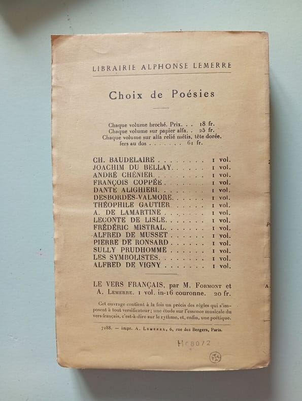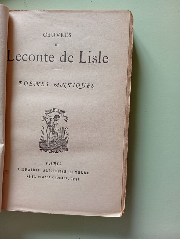 3 volumes in 12 demi toile bleue,pièce de titre cuir noir. poèmes barbares faux- titre,titre 368 pages.Poèmes Antiques Portrait de l’auteur en frontispice titre, 317 pages.Poèmes tragiques édition revue et augmentée faux-titre, titre, 238 pages. Un ex-libris ; Alphonse Lemerre éditeur sans date