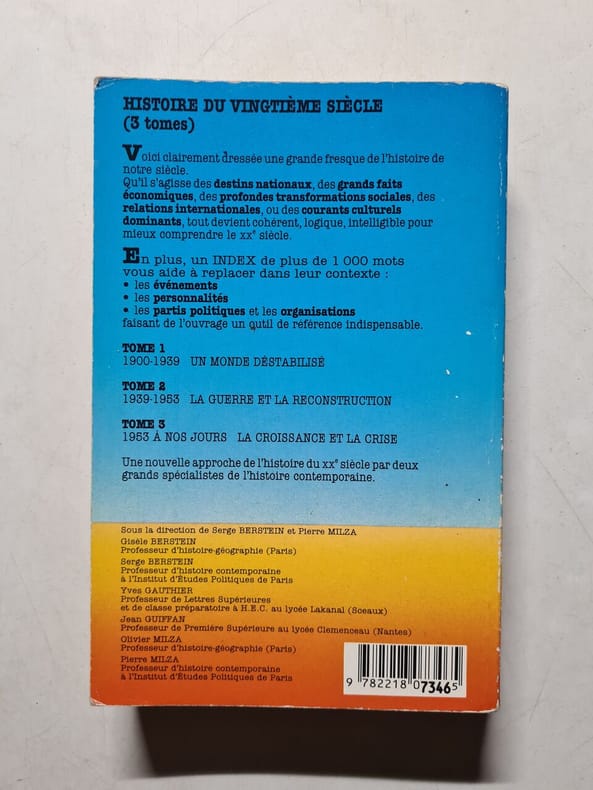 Tome 1 : 1900-1939. Un monde déstabilisé. – Tome 2 : 1939-1953. La guerre et la reconstruction. – Tome 3 : De 1953 à nos jours. La croissance et la crise. — Voici clairement dressée une grande fresque de l’histoire de notre siècle. Qu’il s’agisse des destins nationaux, des grands faits économiques, des profondes transformations sociales, des relations internationales, ou des courants culturels dominants, tout devient cohérent, logique, intelligible pour mieux comprendre le XXème siècle. En plus, un INDEX de plus de 1000 mots vous aide à replacer dans leur contexte : les évènements les personnalités les partis politiques et les organisations faisant de l’ouvrage un outil de référence indispensable. — Une nouvelle approche de l’histoire du XXe siècle par deux grands spécialistes de l’histoire contemporaine. (L'Editeur) — "L'histoire du « second vingtième siècle », que nous proposent Serge Berstein et Pierre Milza a gagné le pari du manuel-fresque qui, en deux volumes de taille comestible, fournit une information de qualité sur près d'un demi-siècle de forte houle. Une respiration en quatre temps – autour des trois dates de 1945, 1953 et 1974 –, le refus raisonné de tout appareil critique, la volonté délibérée de ne pas se placer sur le registre de la synthèse exhaustive, tout en nourrissant les deux tomes des apports de la recherche récente, donnent à l'entreprise sa place spécifique parmi les histoires générales du deuxième versant du siècle." (Jean-François Sirinelli, Vingtième Siècle. Revue d'histoire, à propos des tomes 2 et 3)