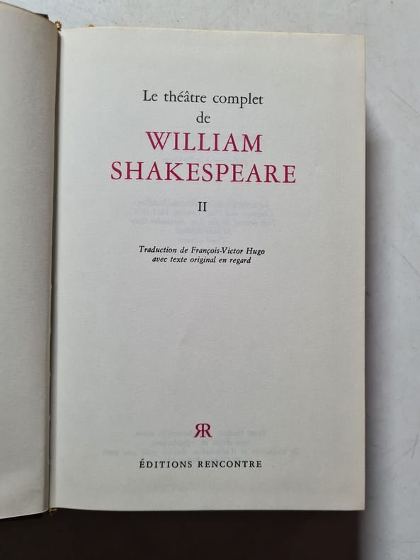 Éditions Rencontre Sans date. Cette édition complète des pièces de William Shakespeare rassemble l'intégralité de ses 34 œuvres théâtrales dans la traduction historique de François Guizot (1821) accompagnée d'environ 500 gravures de John Gilbert. Elle présente l'ensemble du corpus shakespearien incluant tragédies comédies pièces historiques et dernières pièces