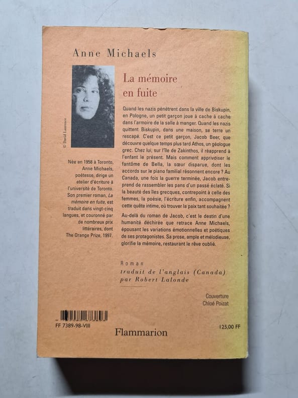 Flammarion Sans date. « La Mémoire en fuite » est le premier roman de la poétesse canadienne Anne Michaels. Il raconte l'histoire de Jacob Beer un survivant juif dont la famille a été exterminée par les Nazis en Pologne en 1939. Le roman explore avec une grande densité poétique les thèmes du traumatisme de la mémoire et des empreintes indélébiles de l'histoire sur la vie personnelle