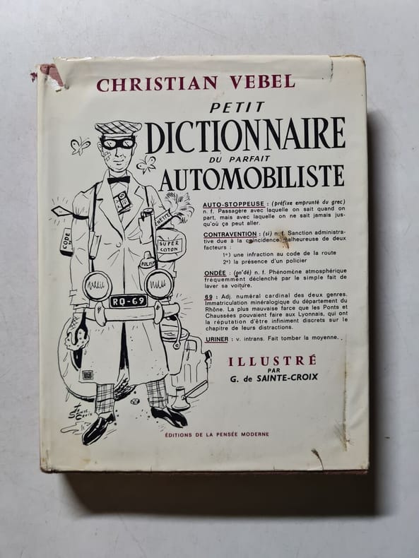 Éditions de la Pensée Moderne Sans date. Ouvrage humoristique et pratique de Christian Vebel publié en 1964 aux Éditions La Pensée Moderne se présentant comme un dictionnaire à l'usage des automobilistes. Il s'agit vraisemblablement d'un guide à la fois informatif et teinté d'ironie sur le monde de la route et de la voiture