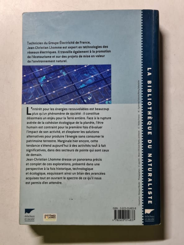 délachaux et niestlé Sans date. L'ouvrage de Jean-Christian Lhomme propose un panorama complet des énergies renouvelables (solaire éolien hydraulique géothermie biomasse) abordant leur histoire leur état des lieux technologique et leurs perspectives écologiques. Il présente ces énergies dans une approche à la fois historique technologique et écologique en soulignant leur importance face à l'urgence climatique et la nécessaire transition énergétique mondiale