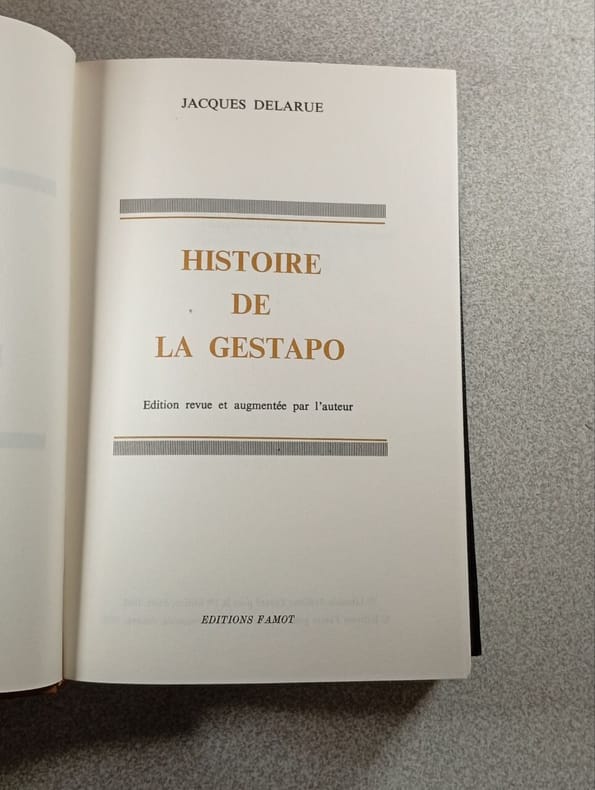 Paris, Fayard, coll. « Les grandes études contemporaines », (6 décembre) 1962 1 vol. (135 x 220 mm) de 472 pp., [3] et 1 ff. Broché. Édition originale. Exemplaire poinçonné du service de presse. Envoi à Jean Desborde, journaliste à Vichy (où travaille Delarue) : « Pour Monsieur Jean Desborde,/cette /Histoire de la Gestapo (ici le titre)/, en hommage respectueux/de l'auteur/Delarue ».