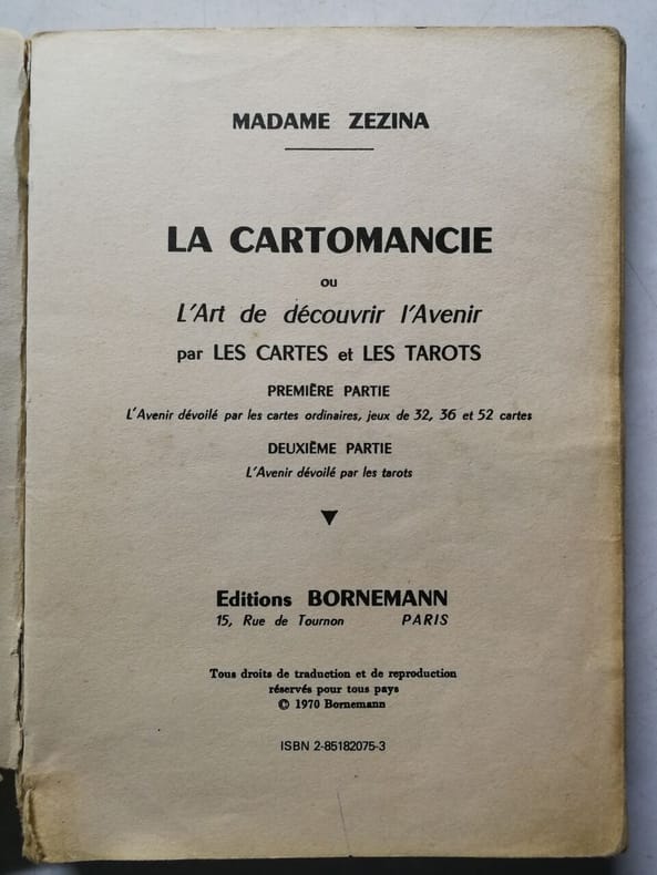 La grande cartomancie ou l'art de faire les cartes aux autres et à soi même, et d'y lire le passé, le présent et l'avenir - d'après les combinaisons française, allemande et espagnole et la méthode italienne du grand Etteilla - suivi de la chiromancie et de la physiognomonie ou moyen infaillible de connaitre le caractère des personnes, leurs inclinaisons, leurs gouts, leurs pasisons, leurs penchants les plus secrets, leus vertus, leurs vices... par l'inspection des mains et des traits du visage - terminé par la phrénologie. Classification Dewey : 133.3-Procédés divinatoires, cartomancie