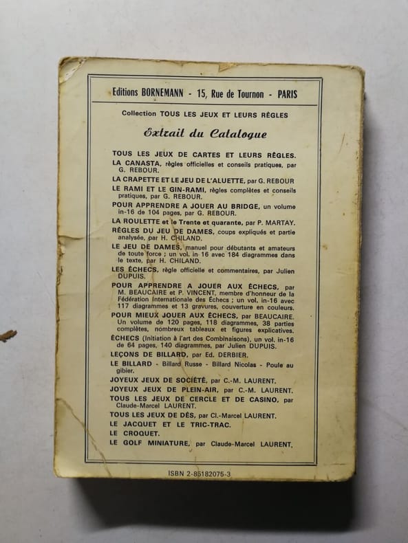 Bernardin -Béchet. Non daté. In-16. Broché. Etat passable, Livré sans Couverture, Dos abîmé, Intérieur frais. 108 pages. Dos manquant. Déchirures et manques sur certaines pages (en fin d'ouvrage) ne gênant la lecture que sur la page de sommaire et quelques lignes des 2 dernières pages. Quelques dessins dans le texte en noir et blanc. Un livret de pages désolidarisé du reste de l'ouvrage. 3 photos disponibles.. . . . Classification Dewey : 133.3-Procédés divinatoires, cartomancie