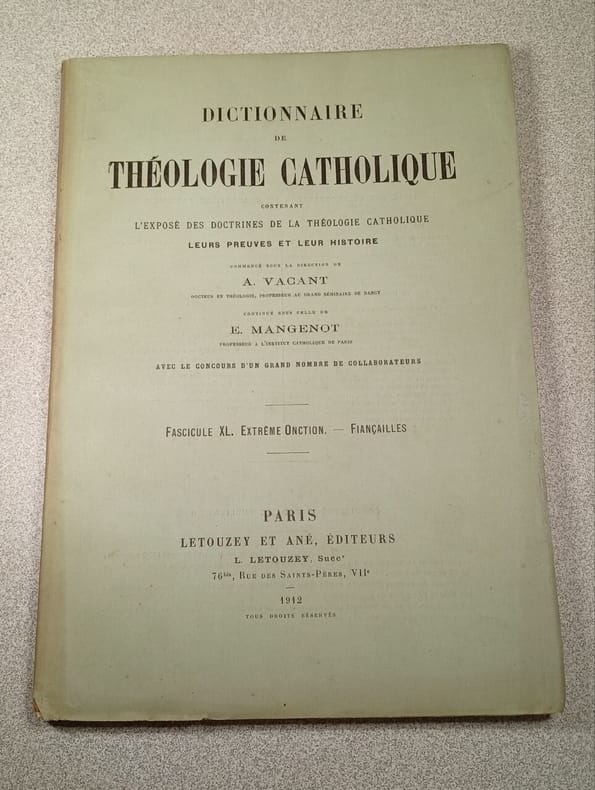 LETOUZEY ET ANE. 1912. In-8. Broché. Etat d'usage, 1er plat abîmé, Dos frotté, Non coupé. Paginé de 1921 à 2272 - texte en 2 colonnes - 1 pagination par colonne - pages non coupées - 1 annotation au stylo noir sur le 1er plat - 1 manque en coin en pied sur le 1er plat.. . . . Classification Dewey : 230-Christianisme. Théologie chrétienne