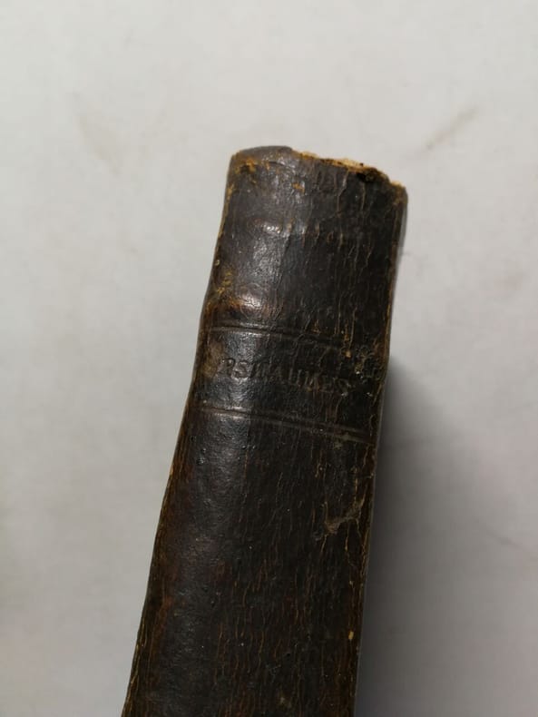 Impression bordelaise. Texte en latin, avec traduction française en regard. L'ouvrage renferme les 150 Psaumes de David, suivis des Cantiques ainsi que d'une Explication succincte de l'oraison dominicale, de la salutation évangélique, du symbole des Apôtres, des Commandements de Dieu et de ceux de l'Eglise. Le livre des Psaumes, selon l’Évangile de Luc et les épîtres de Paul, est interprété par les chrétiens comme une prophétie des mystères du Christ. Cela a eu des conséquences importantes sur l’exégèse des Pères de l’Église, la théologie et surtout la liturgie de toutes les églises chrétiennes. Le monachisme a fait de la récitation incessante des Psaumes la matière première de la prière continuelle et de la liturgie des Heures. Les Pères de l’Église ont continué cette démarche car depuis le ivesiècle, le livre des psaumes est devenu le fondement de la liturgie chrétienne. Le clergé et les chrétiens vont continuer cette pratique dans les siècles suivants. Quoique le psautier des Septante comporte 151psaumes, l’usage chrétien n’en reconnaît que 150 (le psaume 151 n’étant jamais lu à l’église ni en Orient, ni en Occident). Bibles imprimées conservées à Paris, 3016 (pour une édition de 1686).Angles et coiffe supérieure élimés. Papier légèrement oxydé. Présence de quelques rousseurs, tâches claires et plissures angulaires dans le corps d'ouvrage. Du reste, bonne condition.