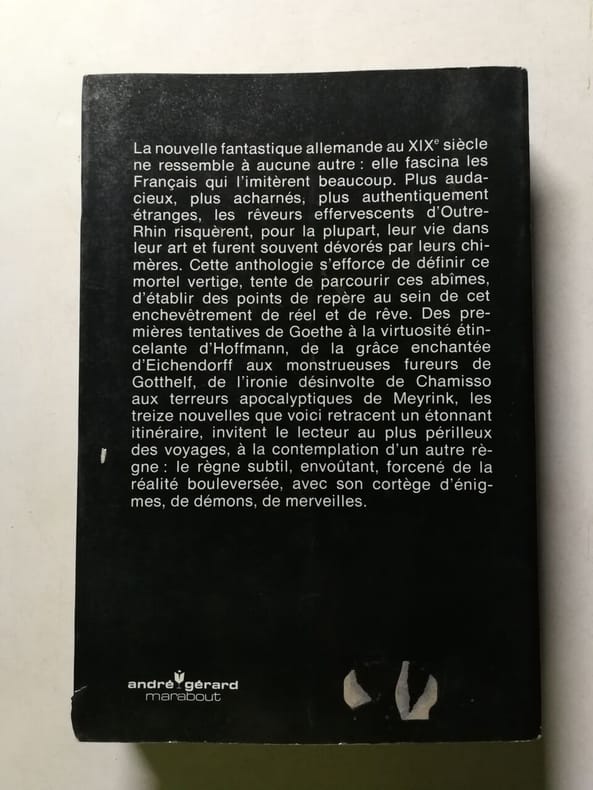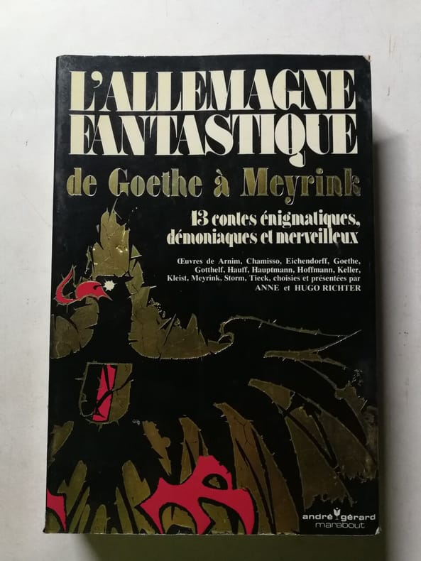 sd (1973?), André Gérard marabout, in-8 broché de 443 pages, illustrations noir et blanc. 13 contes énigmatiques, démoniaques et merveilleux. Oeuvres de Arnim, Chamisso, Eichendorff, Goethe, Gotthelf, Hauff, Hauptmann, Hoffmann, Keller, Kleist, Meyrink, Storm, Tieck, choisies et présentées par Anne et Hugo Richter. | Etat : Etat général correct, couverture un peu défraichie, intérieur taché (Ref.: ref90722)