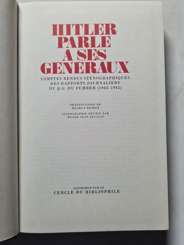 Hitler parle à ses généraux. Comptes rendus sténographiques des rapports journaliers du Q.G. du Führer (1942-1945). Présentation de Helmut Heiber. Traduit de l'allemand par Raymond Henry. Préface de Benoist-Méchin. (Paris: Albin Michel, 1964). [M.C.: Histoire, Allemagne, Deuxième Guerre Mondiale]