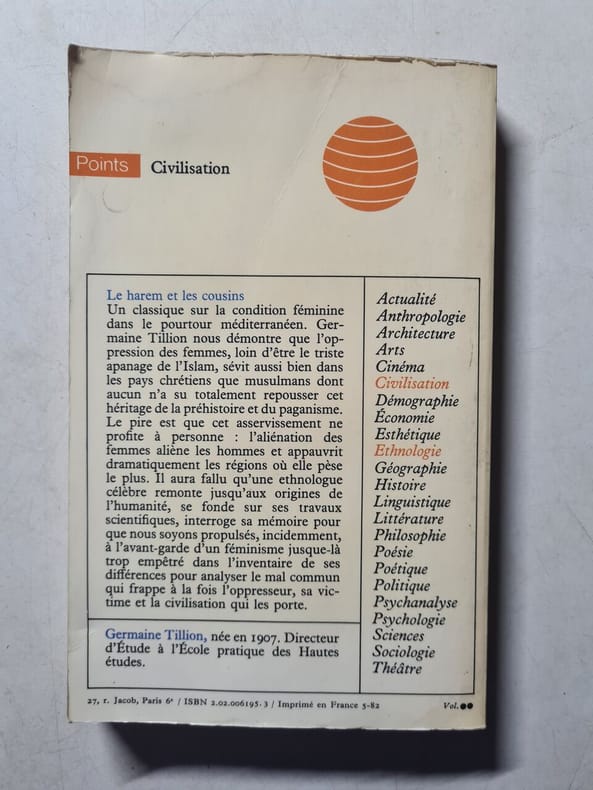 Un essai magnifique. Germaine Tillion (1907-2008) nous démontre que l’oppression des femmes sévit aussi bien dans les pays chrétiens que musulmans et qu'aucun n’a su totalement repousser cet héritage de la préhistoire et du paganisme. Le pire est que cet asservissement ne profite à personne : l’aliénation des femmes aliène les hommes et appauvrit dramatiquement les régions où elle pèse le plus. Il aura fallu qu’une ethnologue célèbre remonte jusqu’aux origines de l’humanité, se fonde sur ses travaux scientifiques, interroge sa mémoire pour que nous soyons propulsés, incidemment, à l’avant-garde d’un féminisme jusque-là trop empêtré dans l’inventaire de ses différences pour analyser le mal commun qui frappe à la fois l’oppresseur, sa victime et la civilisation qui les porte. — "Il fallait tout le courage de Germaine Tillion pour aborder en un seul ouvrage tant de sujets controversés et irritants. Il s'agit bien d'un livre sur la condition de la femme méditerranéenne, mais comme résultante d'une série de phénomènes historiques et sociologiques qui ont eu pour théâtre le monde méditerranéen, pour sujets les sociétés qui l'habitaient et où l'implantation de l'Islam joua un rôle important. L'auteur n'a pas voulu présenter une étude ethnographique limitée, n'a pas cherché à s'abriter derrière une présentation scientifique qui eût rebuté les non-initiés, mais parce que le « destin d'une partie de l'espèce humaine » est concerné très directement, elle a choisi de « s'adresser au plus grand nombre et dans le langage le plus courant ». Sans doute aussi faut-il ajouter que nul n'est mieux placé pour connaître le fatras de préjugés et d'idées fausses et le nombre de mal informés et de malveillants qui surgissent dès que l'on associe la femme et l'Islam. Alors, avec l'humanité qui est la sienne, elle livre simplement ses observations d'ethnologue et propose hardiment ses explications. Pourquoi ce titre : Le harem et les cousins ? Le « harem » parce qu'il symbolise la claustration de la femme; les « cousins » parce qu'ils représentent un type de société dont la structure de parenté est l'endogamie, le mariage préférentiel entre cousins de la lignée paternelle..." (Isabelle Deblé, Tiers-Monde, 1967)