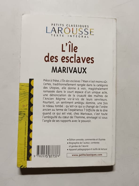 Larousse Sans date. Pièce de théâtre de Marivaux explorant les rapports de domination et de séduction entre maîtres et esclaves caractéristique de son style psychologique et de son analyse des sentiments. L'édition Larousse suggère une publication à vocation scolaire ou pédagogique