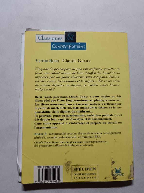 Magnard Sans date. Claude Gueux est un court récit de Victor Hugo inspiré d'un fait divers réel racontant l'histoire d'un ouvrier honnête qui poussé par la misère commet un vol et se retrouve emprisonné. En prison il se lie d'amitié avec un autre détenu mais lorsque celui-ci lui est retiré par l'administration Claude Gueux commet un meurtre qui le conduit à l'échafaud. À travers ce destin tragique Hugo dénonce violemment les conditions carcérales et la société qui crée la misère et le crime