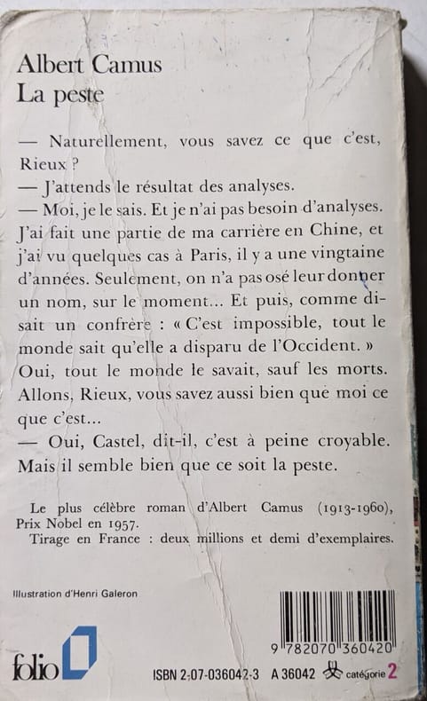 folio Sans date. La Peste d'Albert Camus raconte l'histoire de la ville d'Oran frappée par une épidémie de peste obligeant ses habitants à faire face à l'isolement à la mort et à la solidarité. À travers cette allégorie Camus explore des thèmes comme l'absurde la révolte et la condition humaine face au mal et à l'adversité