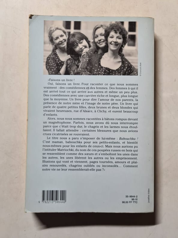 Le récit des quatre soeurs Poliakoff. Espoirs et incertitudes, drames et bonheurs... Le chanteur d'opéra Vladimir de Poliakoff et la danseuse étoile Militza Envald, émigrés de Russie en France après la Révolution de 1917 ont quatre filles. Olga, née en 1928, appelée un temps Laure Thierry, puis Olga Varen, réalisatrice de télévision ; Tania, 1930-1980, actrice sous le nom d'Odile Versois, elle meurt d'un cancer ; Militza, 1932-1988, actrice sous le nom d'Hélène Vallier ; Marina, née en 1938, actrice sous le nom de Marina Vlady. En 1979, les quatre soeurs publient en commun Babouchka, livre de souvenirs, rédigé par Loly Clerc. — "Faisons un livre ! Oui, faisons un livre. Pour raconter ce que nous sommes vraiment: des comédiennes et des femmes. Des femmes à qui il est arrivé tout ce qui arrive aux autres et même un peu plus. Des comédiennes avec une carrière riche et longue, plus longue que la moyenne. Un livre pour dire l'amour de nos parents, la présence de notre mère et l'image de notre père. Un livre qui parle de quatre petites filles, deux brunes et deux blondes qui vivaient heureuses, rue d'Alsace, à Clichy, et eurent beaucoup d'enfants. Alors, nous nous sommes racontées à bâtons rompus devant un magnétophone. Parfois, nous avons dû nous interrompre parce que c'était trop dur, le chagrin et les larmes nous étouffaient. Il fallait attendre: certaines blessures que nous avions crues cicatrisées se rouvraient. Le titre nous a paru s'imposer de lui-même : Babouchka ! C'est maman, babouchka pour ses petits-enfants, et bientôt nous-mêmes pour les enfants de ceux-ci. Mais nous aurions pu l'intituler Matriochki, du nom de ces poupées russes en bois qui se ressemblent comme des soeurs et s'emboîtent les unes dans les autres, les unes libèrent les autres ou les emprisonnent. Illusions qui vont et viennent, pages tournées, amours et plaisirs renouvelés, chagrins oubliés ou inconsolés... Comment notre vie ne leur ressemblerait-elle pas?"