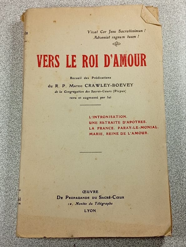 Recueil des Predications du R. P. Mateo Crawley Boevey de la Congregation des Sacres Coeurs revu et augmente par lui meme. L'intronisation ; une retraite d'Apotres ; la France ; Paray le Monial ; Marie Reine de l'amour. Classification Dewey : 230-Christianisme. Théologie chrétienne
