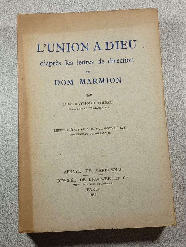 Couverture de papier légèrement insolée ; titre bleu ; XX+288pp+9pp (éditeur) ; illustré d'un portrait en frontispice ; lettre-préface de S.E. Mgr Goodier ; 10e-20e mille ; publié en collaboration avec l'abbaye de Maredsous (Namur, Belgique)