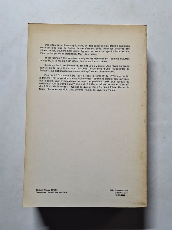 "L'homme du fer, ce sont les traces écrites de la vie ouvrière dans les mines de fer et la sidérurgie lorraines de 1889 à 1930, premier volume d'une collection de documents sur la vie industrielle de la Lorraine. Les ouvriers eux-mêmes écrivent peu, si ce n'est dans leurs organes syndicaux. Là se trouve une première source d'informations. Revendications et doléances présentent pêle-mêle un tableau des conditions de vie et de travail, l'expression de la sensibilité spécifique à certains éléments de cette situation et l'orientation de l'action qui donne un sens à cette sensibilité même. De l'autre côté, des documents patronaux, en nombre moindre, donnent une autre version des mêmes faits. L'autorité administrative apporte un éclairage complémentaire, mais proche du précédent. De toute manière, elle est, dans les documents ouvriers, rangée sans équivoque dans le même camp que l'autorité patronale. La grève de 1905 donne lieu à une intensification de la polémique, reflet de l'intensification de la lutte sur le terrain. Dans cette partie de l'ouvrage, les documents se suivent et se répondent : c'est alors un véritable affrontement des acteurs sociaux par les textes. Mais on n'oublie pas ceux qui n'entrent pas dans le schéma classique. Les syndicats jaunes dénoncent « les meneurs étrangers », les « attentats contre la liberté du travail». Des témoins apportent une note plus sereine, mais non exempte de jugements de valeur. Les instituteurs sont sensibles aux conditions du travail et développent des vues moralisantes sur la vie ouvrière. Les quelques documents émanant du clergé apparaissent comme singulièrement décalés par rapport aux problèmes sur lesquels s'affrontent les parties en cause. Toutefois ils fournissent de précieuses indications sur l'état religieux de la classe ouvrière lorraine et plus particulièrement des immigrés, déjà nombreux au début du siècle (cf. notamment document 61, « L'évêque de Nancy et ses diocésains italiens »). En résumé, on n'insistera jamais assez sur le caractère vivant de tels documents une fois réunis. L'auteur, sans sacrifier au pittoresque a opéré une véritable mise en scène des archives." (François-A. Isambert, Revue française de sociologie, 1976)