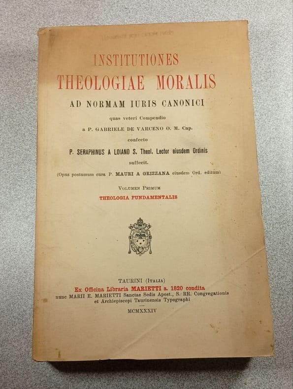Taurini, Marietti 1940 702pp., text in latin, 22cm., pages uncut, original softcvoer (bit used), else VG, [ quas veteri compendio a p.Gabriele de Varceno confecto P.Seraphinus a Loiano suffecit, opus postumum cura P.Mauri a Grizzana]