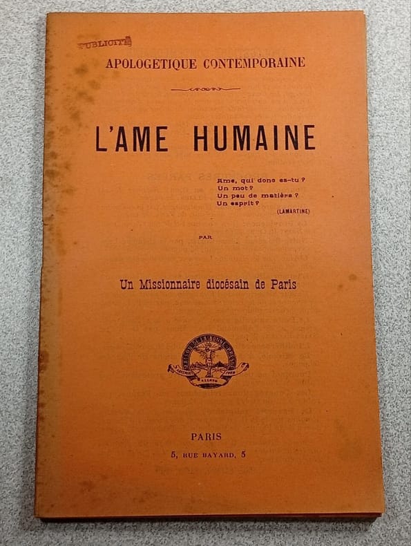 Contents, Chapitres : Homme et animal - Individu et personne - Qu'est-ce que l'âme ? (Ame intellectuelle - Science moderne et forme - L'âme humaine, forme du corps) - Ame et religion (De l'âme à Dieu - Le but de la vie) - L'ame chrétienne - Notes et appendices (Eléments de psycho-physiologie - Le développement psychique de l'enfant - La matière) - Bibliographie petit tampon sur la couverture et sur la page de titres, sinon bon état, papier legerement jauni