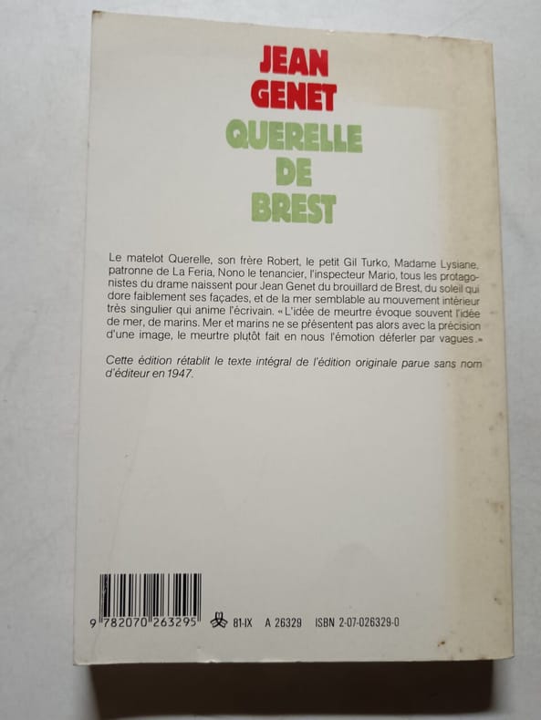 Gallimard, Collection "Biblos", 1990. Fort volume in-8 broché, XXX-787 pages. : couv. ill. en coul., préf. de Philippe Sollers. Contient : Journal du voleur ; Querelle de Brest ; Pompes funèbres / Jean Genet. Très bon état, comme neuf.