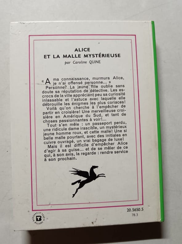 Bibliothèque Verte Sans date. Alice Malle une jeune héroïne se retrouve plongée dans une aventure mystérieuse qu'elle devra élucider. Le roman appartient à la célèbre collection Bibliothèque Verte spécialisée dans les histoires palpitantes pour la jeunesse