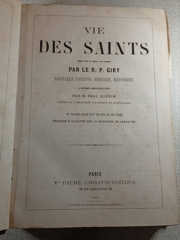 Bar-le-Duc, imprimerie de Madame Laguerre, rue Rousseau, 18 Relié 1858 "Quatre volumes in-4 (19 x 26,7 cm), reliure demi-peau, dos lisses, 1439 pages, ""Vie des saints, d'après Lipoman, Surius, Ribadeneira et autres auteurs, par le R. P. Simon Martin, religieux de l'Ordre des Minimes, recherchée dans les sources, corrigée sur les actes originaux qui ont paru depuis et mise dans la pureté de notre langue, avec des discours sur les mystères de Notre-Seigneur et de la Sainte Vierge, le Martyrologe romain traduit en français et mis à la tête de chaque jour, et le martyrologe des saints de France qui ne sont pas dans le romain ; par le R. P. François Giry, religieux du même ordre. Edition revue et augmentée de la vie des Saints et bienheureux nouveaux et des personnes de notre temps mortes en odeur de sainteté, avec une table alphabétique des matières de dogme, de morale, etc., répandues dans l'ouvrage, par une société d'ecclésiastiques. Sous la direction de M. l'Abbé P. G."" ; pliures au dos, quelques épidermures sur le cuir, coupes frottées, note manuscrite sur la page de titre, manque sur le bord des deux derniers feuillets du tome 3, assez bon état général. Livraison a domicile (La Poste) ou en Mondial Relay sur simple demande."