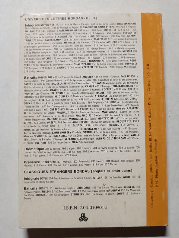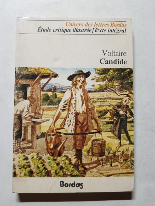 Bordas Sans date. Candide jeune homme naïf élevé dans l'optimisme philosophique est chassé du château de Thunder-ten-tronckh et parcourt le monde. À travers une série d'aventures absurdes et de malheurs il découvre la cruauté et l'absurdité du monde remettant en cause la doctrine de son précepteur Pangloss. Après de nombreuses tribulations en Amérique et en Europe il finit par se retirer avec ses compagnons pour "cultiver son jardin" adoptant une philosophie de travail modeste et concret