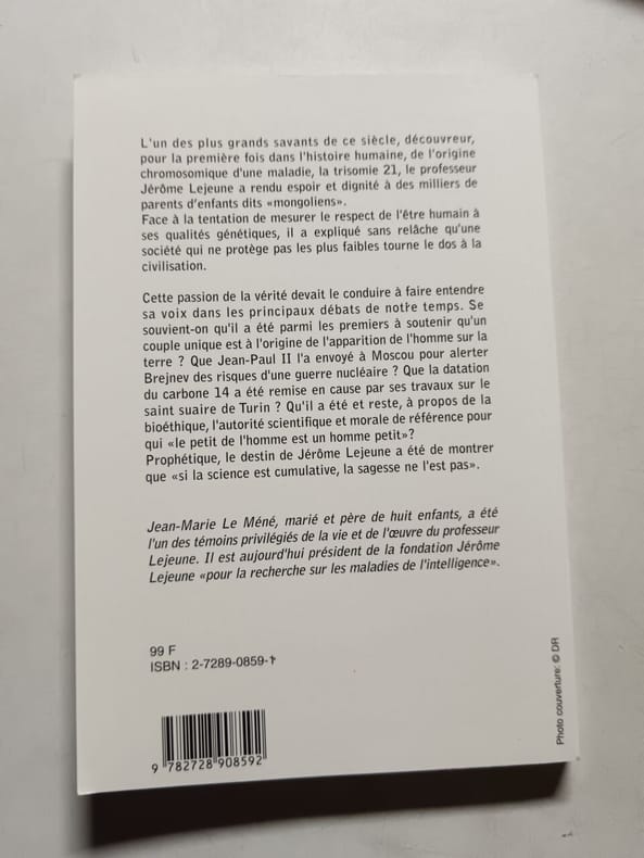 Mame 1997 159 pages in8. 1997. Broché. 159 pages. L'un des plus grands savants de ce siècle découvreur pour la première fois dans l'histoire humaine de l'origine chromosomique d'une maladie la trisomie 21 le professeur Jérôme Lejeune a rendu espoir et dignité à des milliers de parents d'enfants dits mongoliens .Face à la tentation de mesurer le respect de l'être humain à ses qualités génétiques il a expliqué sans relâche qu'une société qui ne protège pas les plus faibles tourne le dos à la civilisation. Cette passion de la vérité devait le conduire à faire entendre sa voix dans les principaux débats de notre temps. Se souvient-on qu'il a été parmi les premiers à soutenir qu'un couple unique est à l'origine de l'apparition de l'homme sur la terre ? Que Jean-Paul II l'a envoyé à Moscou pour alerter Brejnev des risques d'une guerre nucléaire ? Que la datation du carbone 14 a été remise en cause par ses travaux sur le saint suaire de Turin ? Qu'il a été et reste à propos de la bioéthique l'autorité scientifique et morale de référence pour qui le petit de l'homme est un homme petit ?Prophétique le destin de Jérôme Lejeune a été de montrer que si la science est cumulative la sagesse ne l'est pas