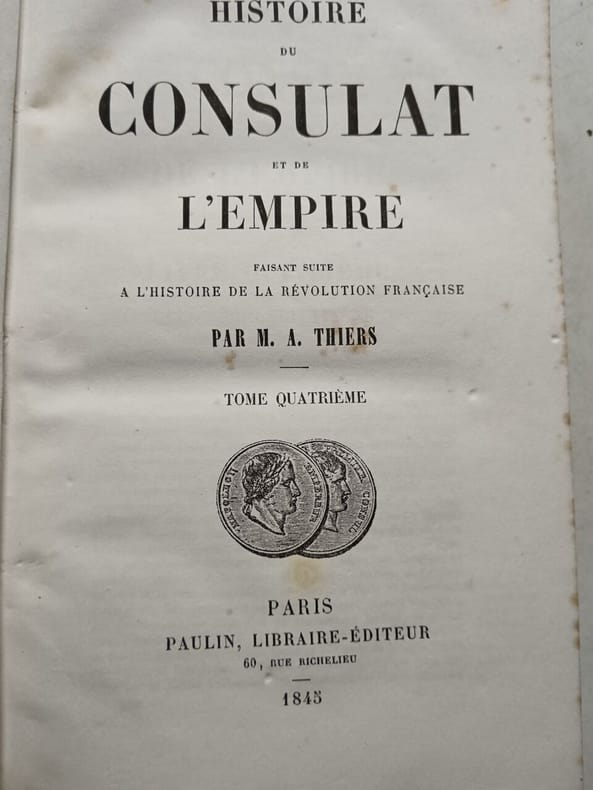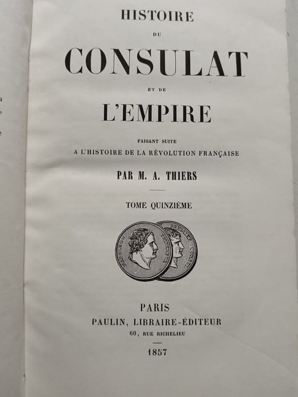 Paulin Libraire-Éditeur Sans date. Ouvrage historique monumental en 21 volumes (1845-1862) écrit par Adolphe Thiers homme politique et premier président de la Troisième République qui retrace l'histoire du Consulat et de l'Empire français. Il fait suite à son 'Histoire de la Révolution française' et a longtemps été considéré comme une référence majeure dans l'historiographie française