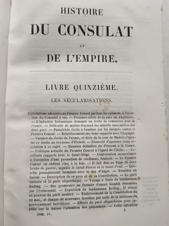 Tome 1. 494 pages. Constitution de l'An VIII, Administration intérieure, Ulm et Gènes, Marengo. Tome 2. 456 pages. Héliopolis, Armistice, Hohenlinden, Machine infernale, Les neutres. Tome 3. 570 pages. Evacuation de l'Egypte, Paix générale, Concordat, Tribunat, Consulat à vie. Tome 4. 620 pages. Les sécularisations, Rupture paix d'Amiens, Camp de Boulogne, Conspiration de Georges. Tome 5. 473 pages. L'Empire, Le sacre, troisième coalition. Tome 6. 573 pages. Ulm et Trafalgar, Austerlitz, Confédération du Rhin. Tome 7. 684 pages. Iéna, Eylau, Friedland et Tilsit. Tome 8. 687 pages. Fontainebleau, Aranjuez, Bayonne. Tome 9. 596 pages. Baylen, Erfurt, Somo-Sierra. Tome 10. 511 pages. Ratisbonne, Wagram. Tome 11. 476 pages. Talavera et Walcheren, le divorce. Tome 12. 709 pages. Avertissement de l'auteur, Blocus continental, Torrès-Védras, Fuentès d'Onoro. Tome 13. 583 pages. Le Concile, Tarragone, Passage du Niémen. Tome 14. 686 pages. Moscou, La Bérézina. Tome 15. 614 pages. Washington et Salamanque, Les cohortes, Lutzen et Bautzen. Tome 16. 693 pages. Dresde et Vittoria, Leipzig et Hanau. Tome 17. 911 pages. L'invasion, Brienne et Montmirail, Première abdication, Conclusion. Tome 18. 656 pages. Restauration des Bourbons, Gouvernement de Louis XVIII, Congrès de Vienne. Tome 19. 637 pages. L'Ile D'Elbe, L'Acte additionnel, Le Champ de Mai. Tome 20. 810 pages. Waterloo, Seconde abdication, Sainte-Hélène. Atlas de la Révolution, du Consulat et de l'Empire. Image disp.