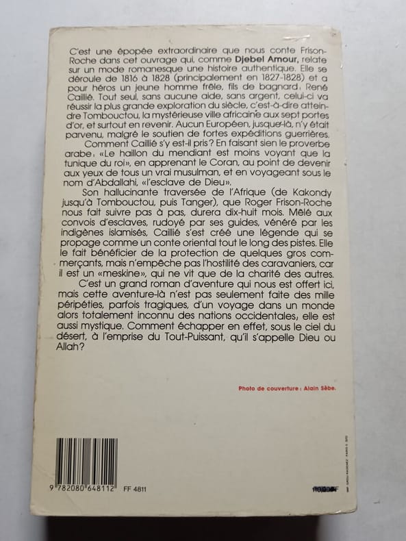 J'ai lu 544 pages poche. Sans date. Poche. 544 pages. Le 17 juin 1816 René Caillié s'embarque pour l'Afrique. Il a seize ans et une seule ambition : être le premier à découvrir Tombouctou la cité mystérieuse au cœur de cette Terra Incognita dont aucun Blanc n'est revenu.Lui réussira car il a compris que " le haillon du mendiant est moins voyant que la tunique du roi ". Pour traverser l'Afrique islamisée le chapelet coranique est le meilleur des passeports. Désormais René Caillié s'appelle Abdallahi l'esclave de Dieu et c'est en pèlerin qu'il entrera à Tombouctou. Puis miné par les fièvres défiguré par le scorbut il lui faudra ensuite franchir le désert pour rejoindre Tanger...Hallucinant et authentique périple mais aussi quête mystique un livre fort et riche