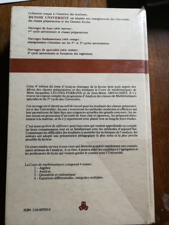 quelques figures géométriques dans le texte en noir et blanc 2eme édition, 1989 Contents, Chapitres : Introduction - 1. Analyse : Séries numériques - Intégrales généralisées - Limite d'une suite de fonctions - Intégrales dépendant d'un paramètre - Séries entières - Normes en analyse et en analyse numérique - Convergence de suites de vecteurs - Analyse de Fourier des signaux périodiques - Utilisation des résultats de topologie - Calcul différentiel - 2. Algèbre : Polynome minimal - Théorie spectrale d'un endomorphisme - Réduction de la matrice d'un endomorphisme - Systèmes différentiels - Espaces hermitiens et euclidiens - Systèmes orthonormés - Formes bilinéaires - Adjoint, opérateurs hermitiens et unitaires - Endomorphismes normaux - Quadriques - 3. Géométrie : Courbes - Surfaces - Intégration - Calcul d'intégrales multiples - Formes différentielles, intégrale de p-surface - Théorème de Stokes - Fonctions holomorphes, théorème des résidus - Index couverture assez propre mais avec des traces de pliures aux coins des plats, coiffe supérieure un peu frottée, intérieur propre, papier à peine jauni, coins un peu cornés en début d'ouvrage, cela reste un bon exemplaire du Tome 2 seul du Cours de mathématiques de Krée et Vauthier pour la 2eme année du DEUG, Université Pierre et Marie Curie