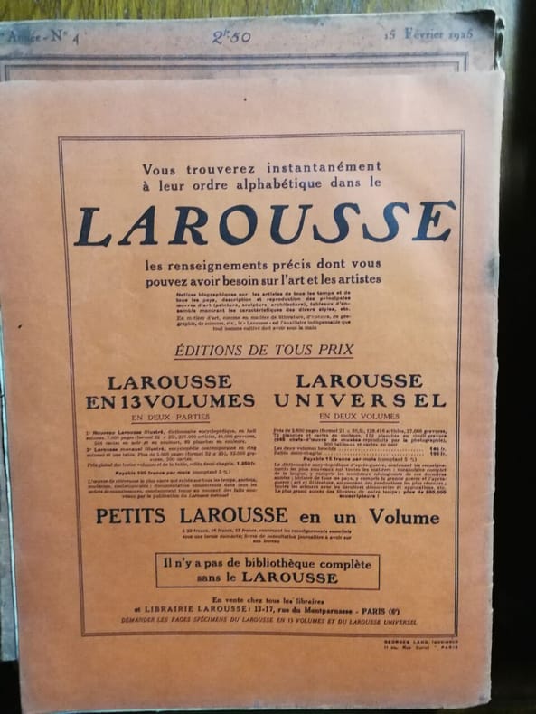 Paris, Les Nouvelles Littéraires, Librairie Larousse, impr. Georges Lang, à Paris 1925 In-4 31 x 23,5 cm. Reliure éditeur pleine toile bordeaux, titre or sur le dos et le premier plat, couvertures non conservées, 1025 pp., nombreuses illustrations, sommaire. Reliure défraîchie et restaurée avec accroc en tête de dos, charnières fendillées, intérieur assez frais.